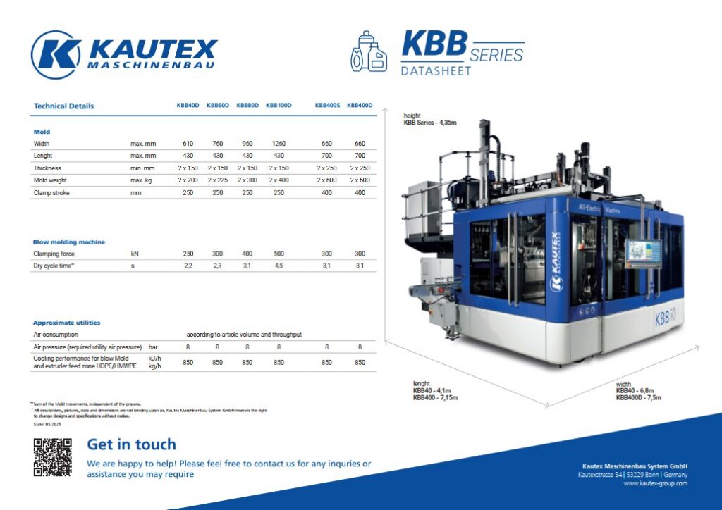 The KBB Series is purpose-built for demanding applications in consumer, pharmaceutical and industrial packaging, where maximum precision and high output are essential. Designed for production of bottles, containers, and jerry cans up to 30 L, it delivers exceptional efficiency and reliability.